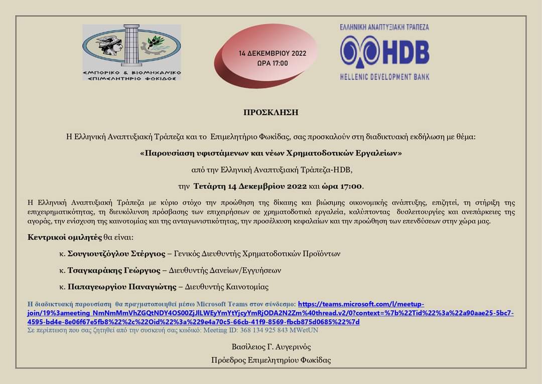 Το Επιμελητήριο Φωκίδας και η Ελληνική Αναπτυξιακή Τράπεζα διοργανώνουν εκδήλωση με θέμα: «Παρουσίαση υφιστάμενων και νέων Χρηματοδοτικών Εργαλείων» Στην εκδήλωση που θα πραγματοποιηθεί διαδικτυακά την Τετάρτη 14 Δεκεμβρίου 2022 και ώρα 17:00